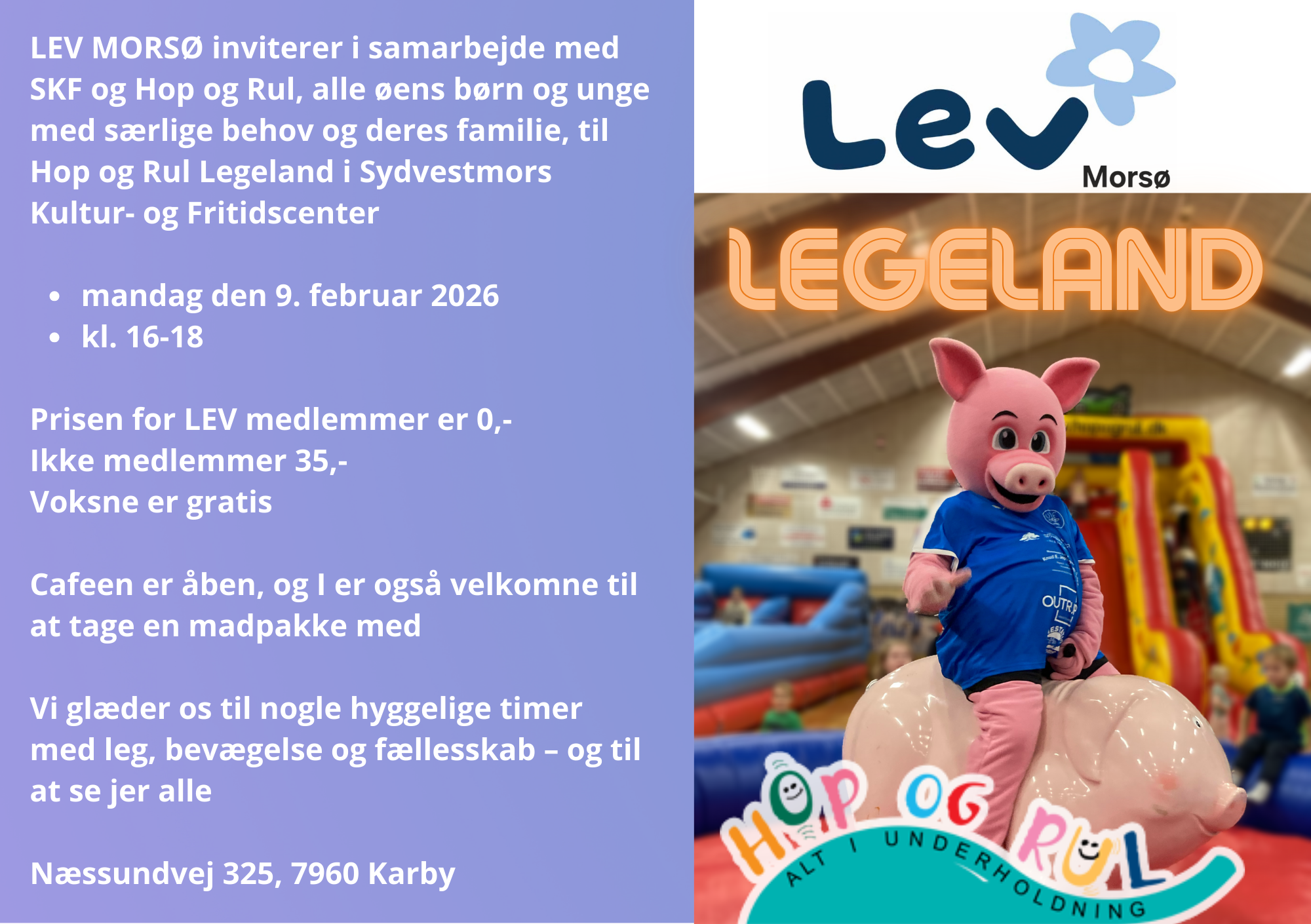 Lev Morsø inviterer i samarbejde med SKF og Hop og Rul alle øens børn og unge med særlige behov og deres familier til Hop og Rul Legeland i Sydvestmors Kultur- og Fritidscenter, Næssundvej 325, 7960 Karby, mandag den 9. februar kl. 16-18