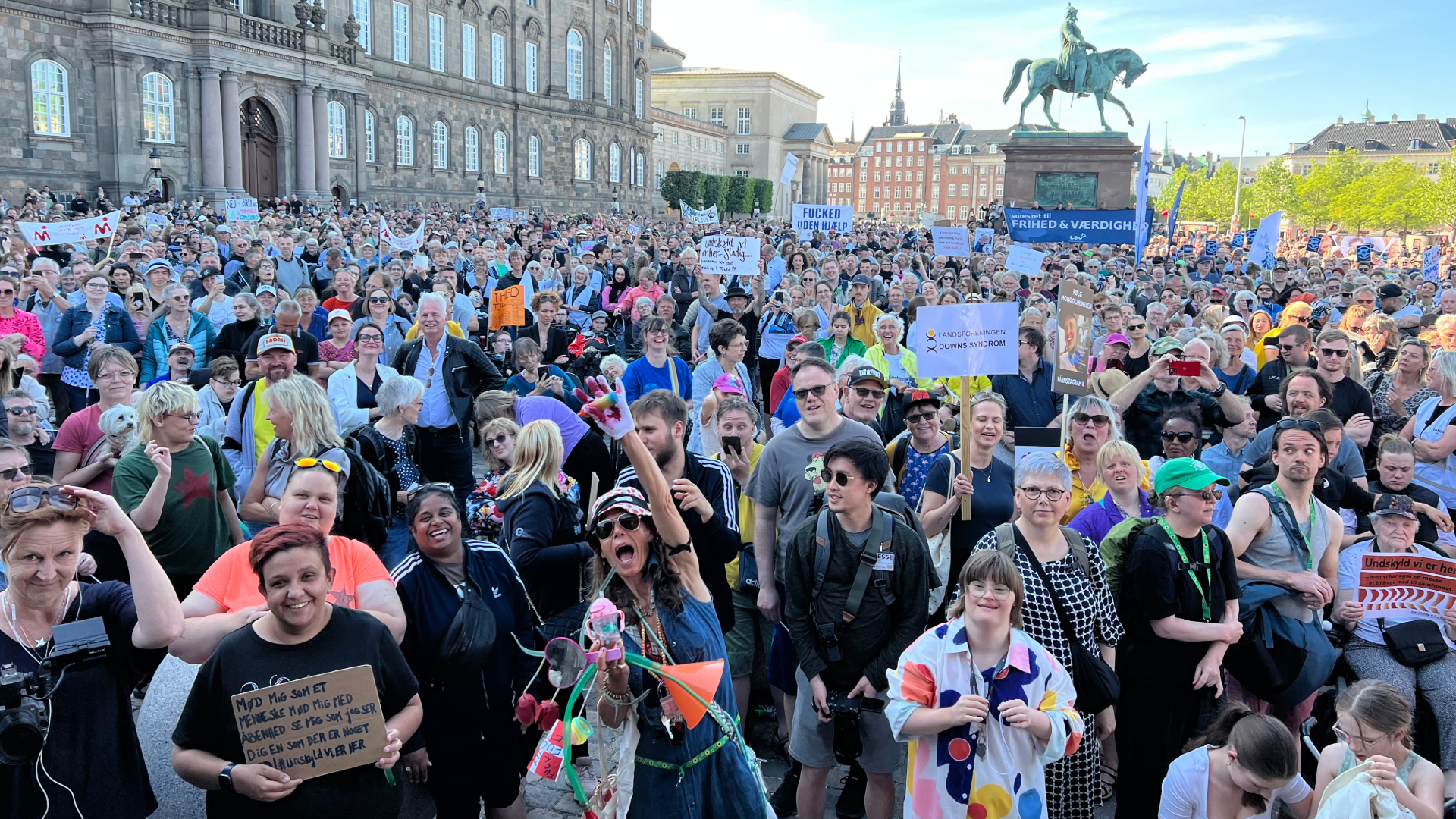 Fra alle hjørner af Danmark ankom flere tusinde mennesker i går til Christiansborg Slotsplads for at deltage i en historisk demonstration mod regeringens og KL’s handicappolitiske aftale – en aftale, der varsler flere og skarpere spareknive på handicapområdet og mere magt og tvang mod beboere på landets botilbud. En aftale, som hundredvis af demonstranter sagde et rungende ”NEJ” til.